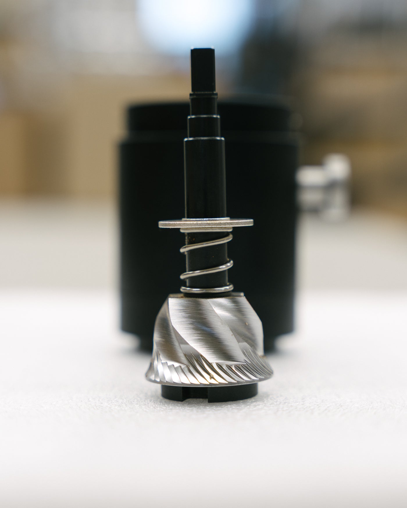 - A small magnetic brush attached to the funnel cleans the burrs and reduces grind retention.